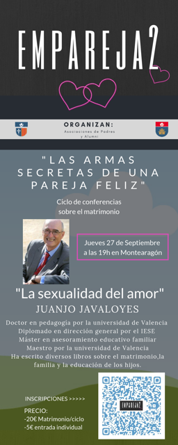 La primera conferencia del jueves 27 de septiembre a las 19:00 horas, que estará impartida por JUANJO JAVALOYES y versará sobre “La sexualidad del amor”.