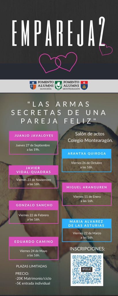 Este Primer ciclo de conferencias se va a centrar en "Las armas secretas de una pareja feliz”. Las Asociaciones de Padres y de Alumni de Sansueña y Montearagón hemos hecho el esfuerzo de traer a grandes expertos de reconocido prestigio para ayudar a las familias a descubrir el valor de la familia y cómo mantener el “flechazo” del primer momento en el que todo es felicidad y armonía.